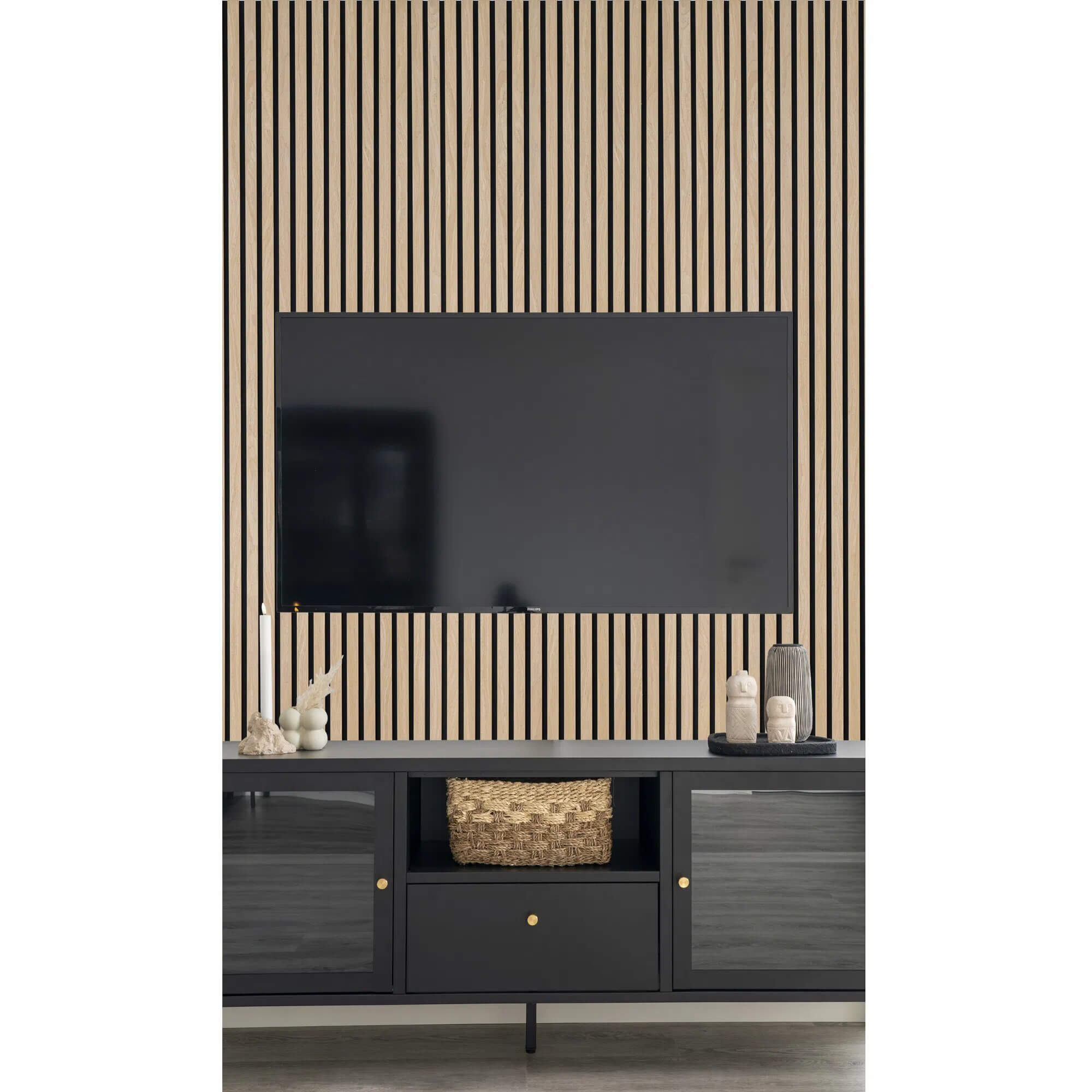 Akustikpanel i træfiner. Dette panel er designet til at tilføre en smuk og funktionel akustisk løsning til enhver stue, kontor eller enhver anden rum. Med sit naturtræslook i egetræ, vil dette akustikpanel ikke kun forbedre lydabsorberingen i rummet, men også tilføre en elegant og stilfuld finish.