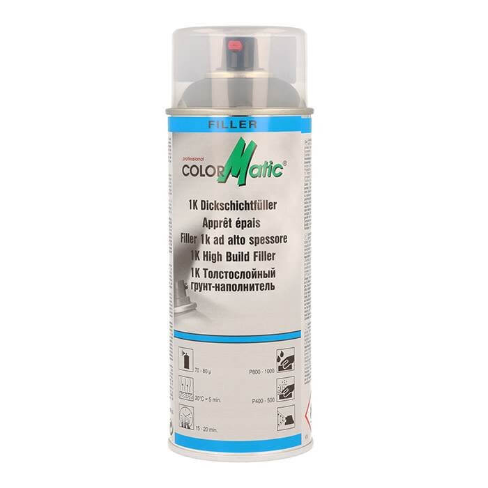 ColorMatic 1K High-Build Filler er et 1K akryl spartelmasse med bedst mulig påfyldnings- og dækkekapacitet. Høj lagtykkelse i en påføring. Hæfter godt til stål, aluminium, polyester og på de fleste plastik overflader. Kan ikke påføres med 1K Grunder (HG1 til HG7) ovenpå.