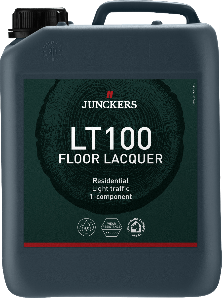 Velkommen til Junckers Gulvlak LT100! Denne slidstærke 1-komponent vandbaserede lak er ideel til grund- og toplakering af afslebne eller ubehandlede trægulve i boliger. Lakken er også velegnet til lejlighedsvis vedligeholdelse af tidligere lakerede trægulve. Junckers Gulvlak LT100 er et indeklimamærket produkt, hvilket betyder, at det har gennemgået omfattende prøvning for afgasning og lugt, og derfor ikke indeholder kemiske stoffer, der kan påvirke luftkvaliteten i rummet negativt.