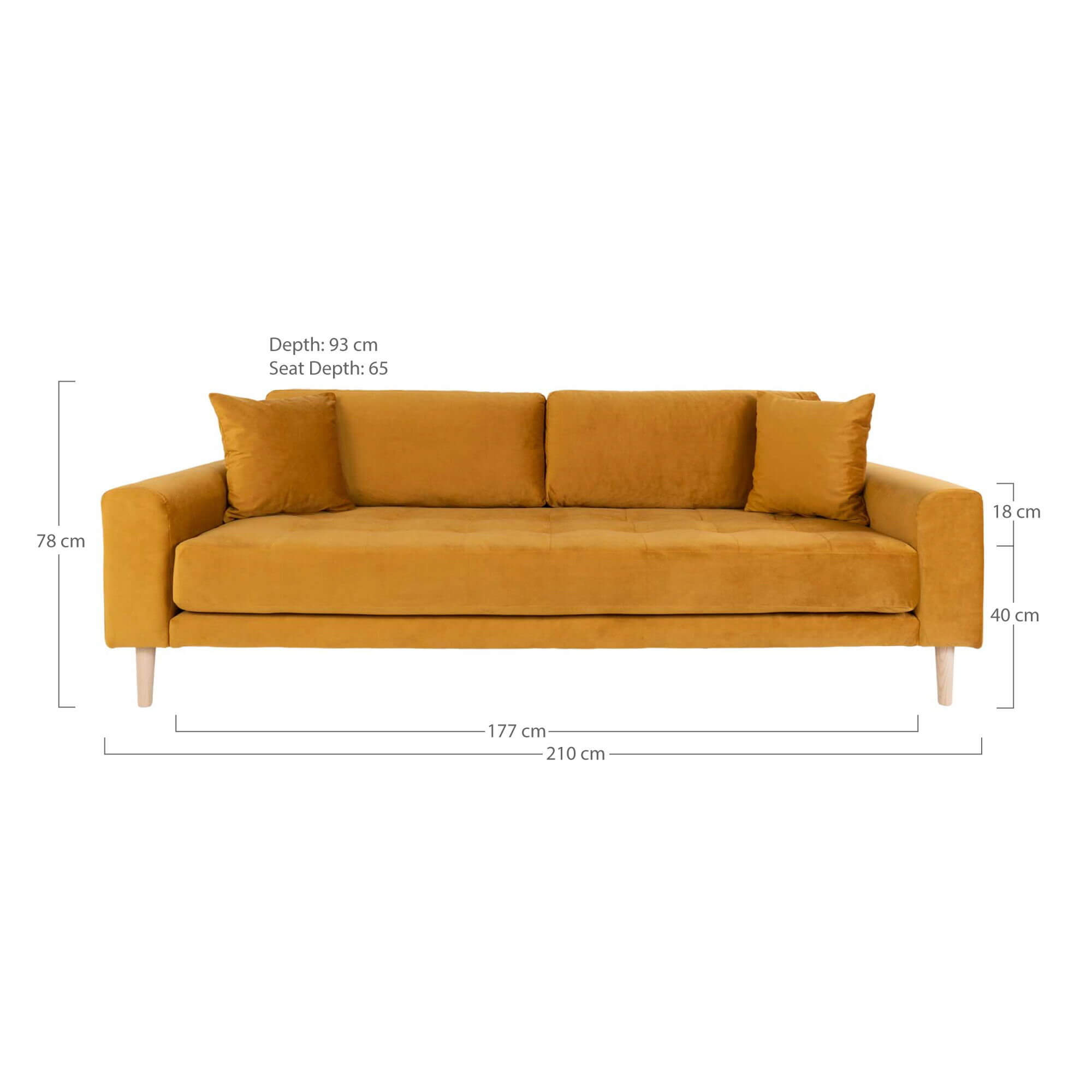 Lido 3 Personers Sofa - 3 Personers Sofa, sennepsgul velour med to puder og natur træben, HN1004