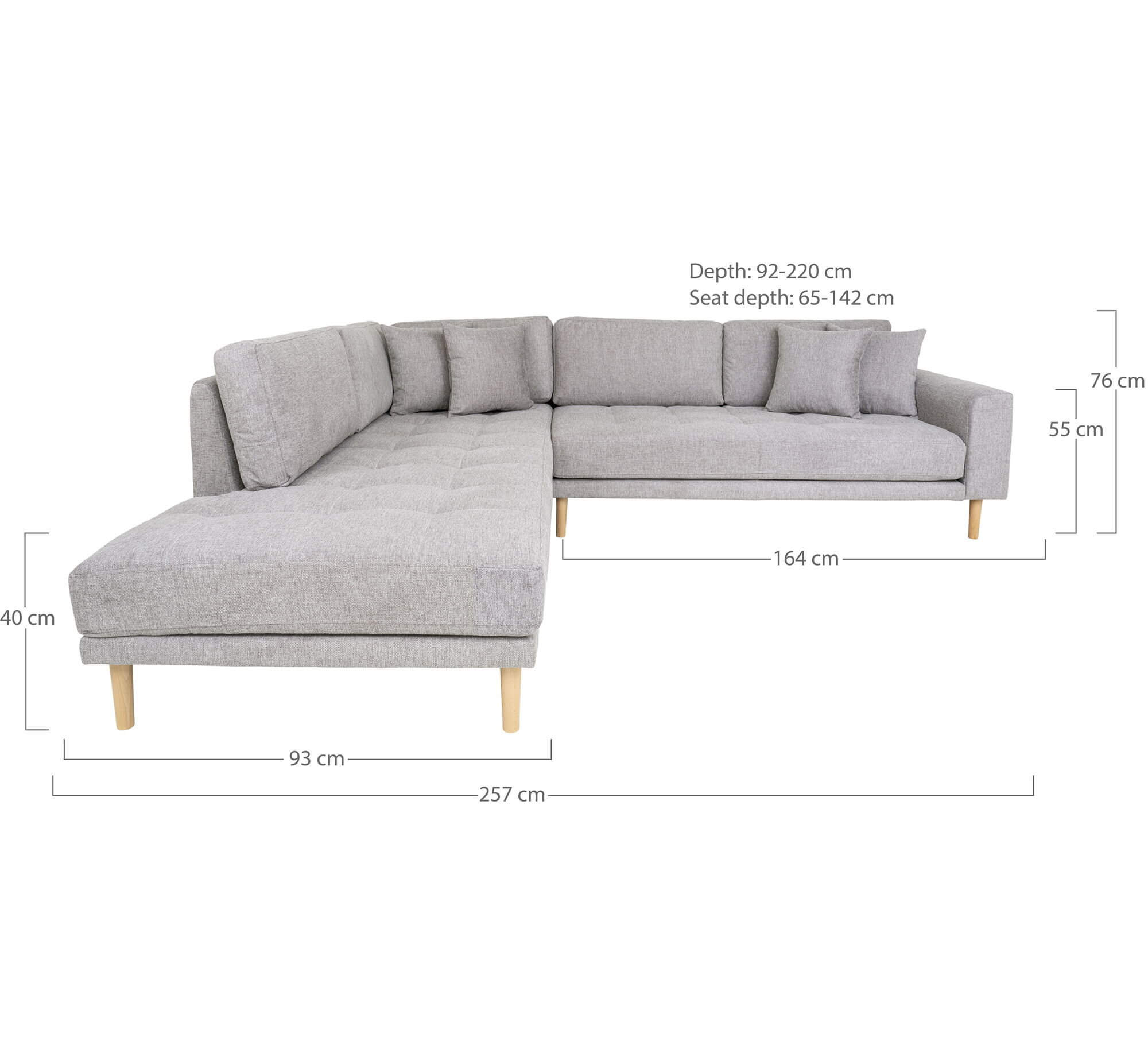 Lido Hjørnesofa Åben Ende - Hjørnesofa Åben Ende,venstrevendt i lysegrå med fire puder og natur træben, HN1040-Polyester, Skum, Bøg