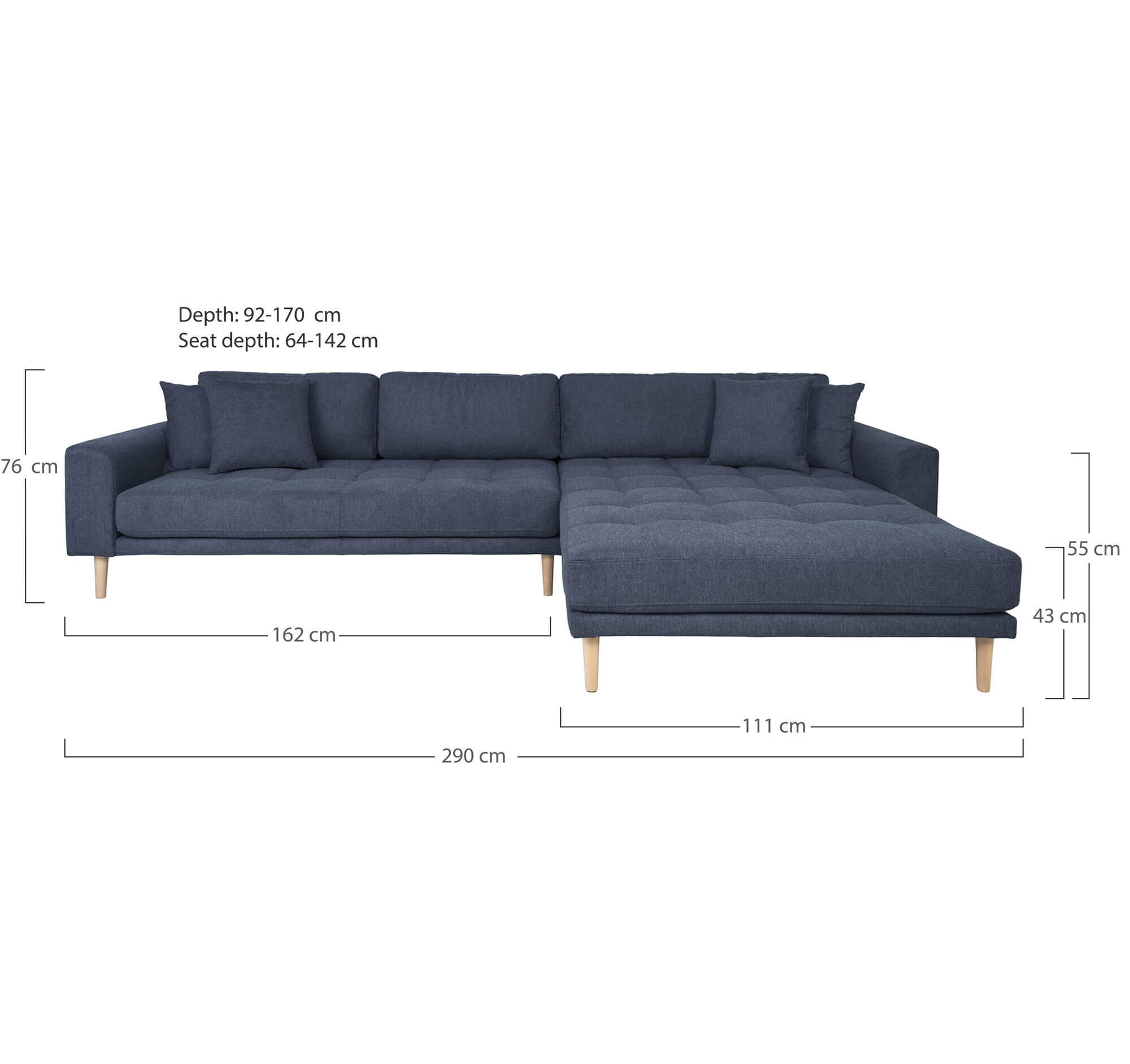 Lido Lounge Sofa - Lounge Sofa, højrevendt i mørkeblå med fire puder og natur træben, HN1035-Polyester, Skum, Bøg