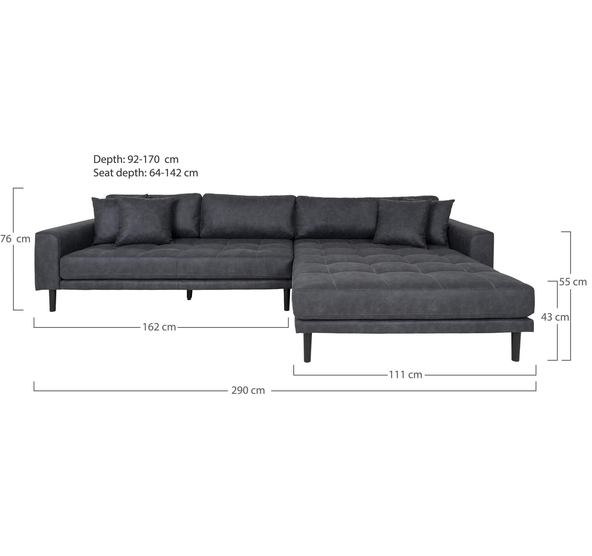 Lido Lounge Sofa - Lounge Sofa, højrevendt i mørkegrå microfiber med fire puder og sort træben, HN1000