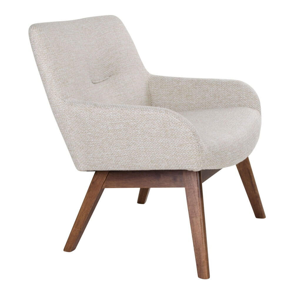 - Komfortabel og elegant loungestol i sandfarvet stof og med valnøddeben