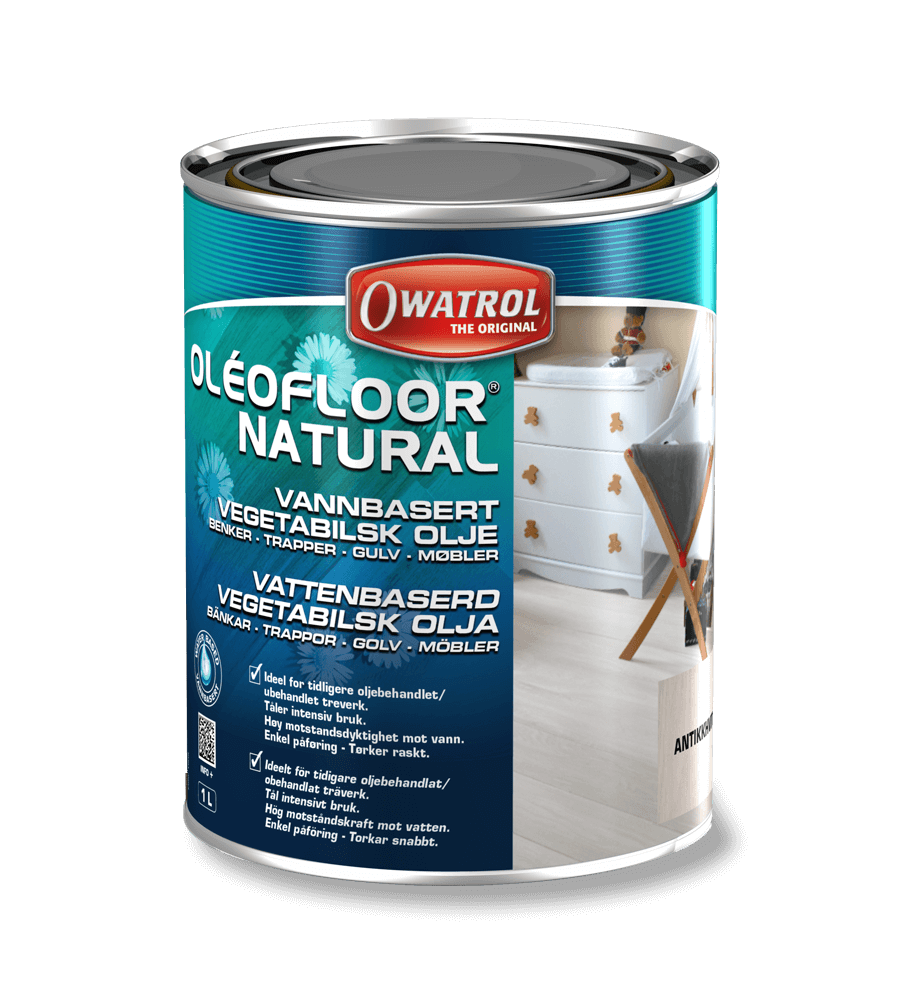 Oleofloor Natural er en slidstærk vandbaseret indendørs olie med mat oliefinish. Ideel til brug på tidligere olierede flader. Enkel påføring og hurtig tørrende.Til gulve, trapper, bordplader, møbler etc. Findes i kulørerne: Antik hvid og Antik grå.