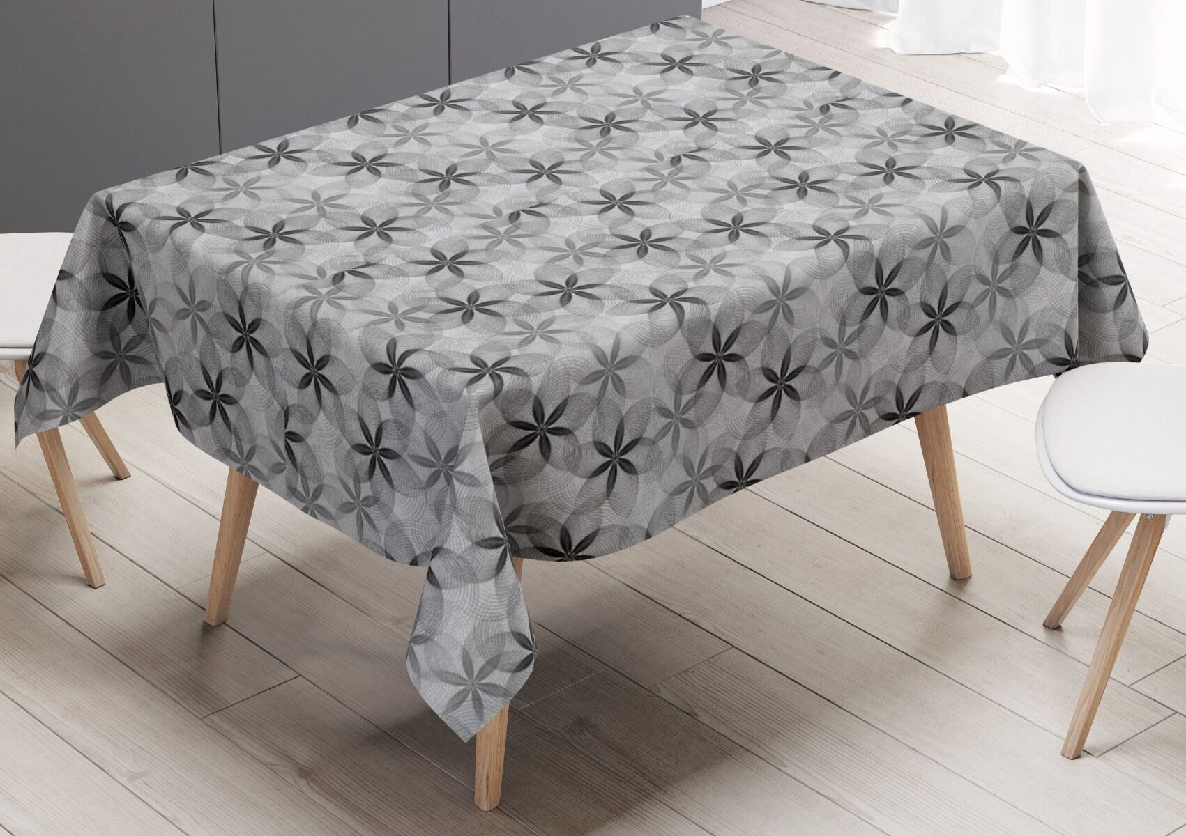 Voksdug med grafisk blomstermønster i grå. Dugen er 140 cm. bred